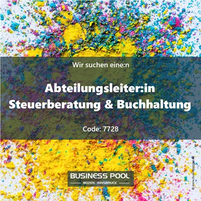 Unser Kunde, ein modernes Beratungsunternehmen, sucht für das Wipptal zum ehestmöglichsten Eintritt eine Abteilungsleitung für den Bereich Steuerberatung und Buchhaltung. Sie werden von einem erfahrenen Kollegen eingearbeitet und übernehmen im Anschluss die Teamleitung und sind am Sitz unseres Kunden in Sterzing Verantwortliche:r für alle buchhalterischen und steuerlichen Thematiken. Spricht Sie diese abwechslungsreiche und auch verantwortungsvolle Position - in einem stabilen Unternehmen - an? Dann freuen wir uns auf Ihre Bewerbung als: